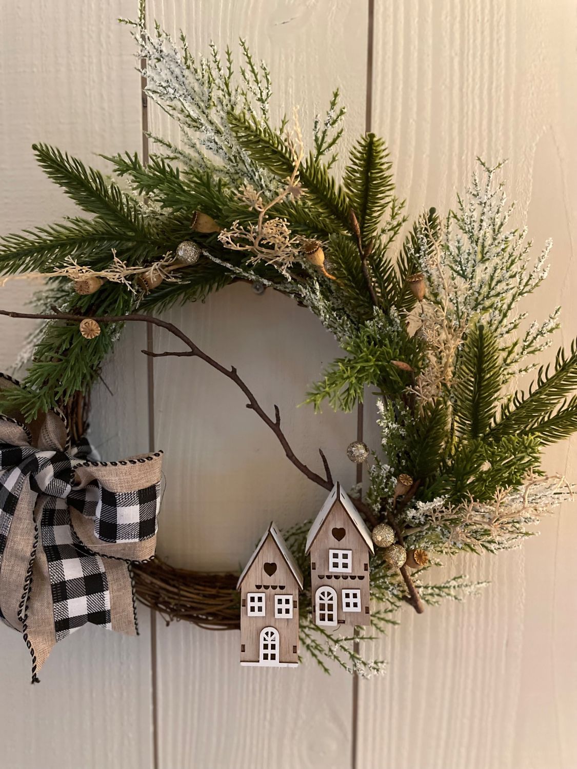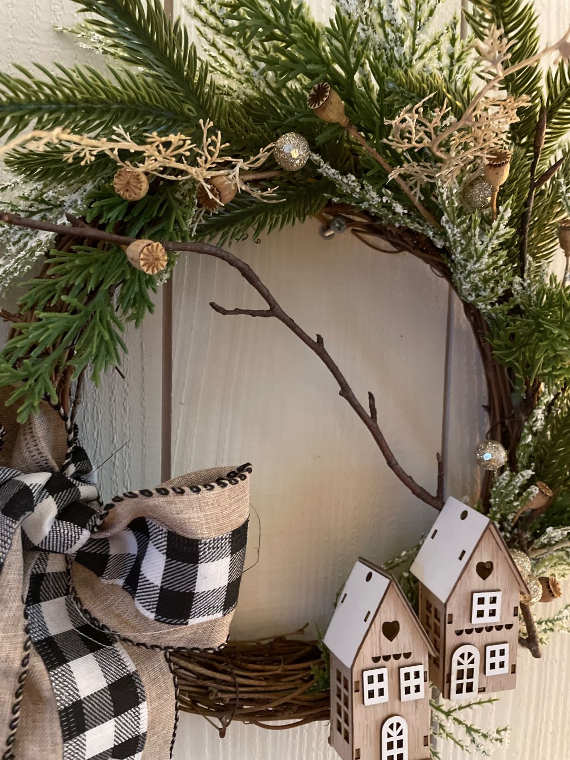 Elle se compose de branches de sapin, pin saupoudré de neige, baies dorées, brindilles, fleurs séchées et d'un ruban de jute.
