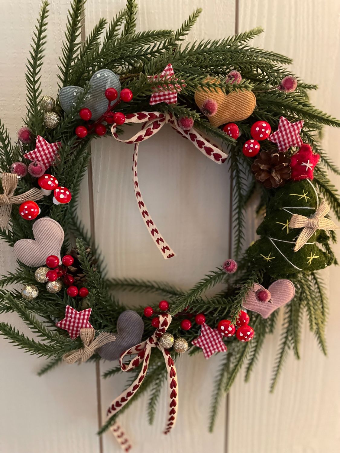 Elle est composée de branches de Norfolk artificiel, d'un sapin en feutrine, de coeurs et étoiles en tisus, de baies, minis champignons, pommes de pin et rubans.