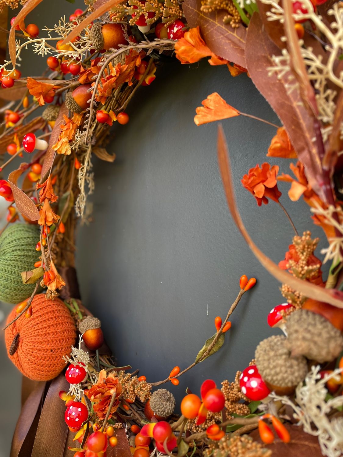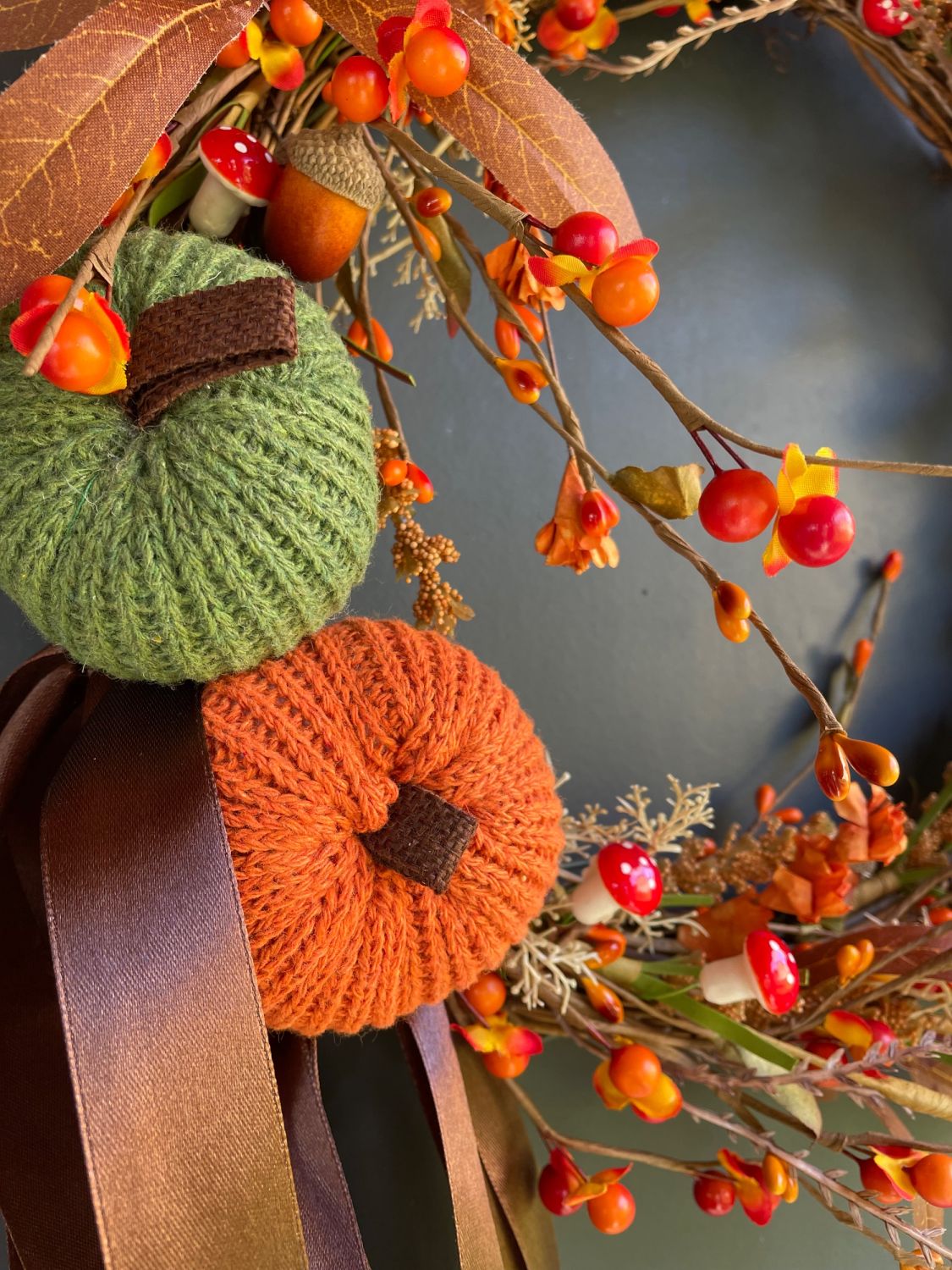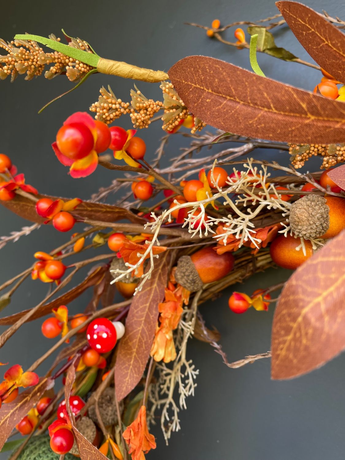Elle se compose d'une base de couronne en vigne naturelle, de branchages, baies et champignons artificiels et de fleurs en papier, ainsi que de rubans en satin et de petites courges en tricot.
