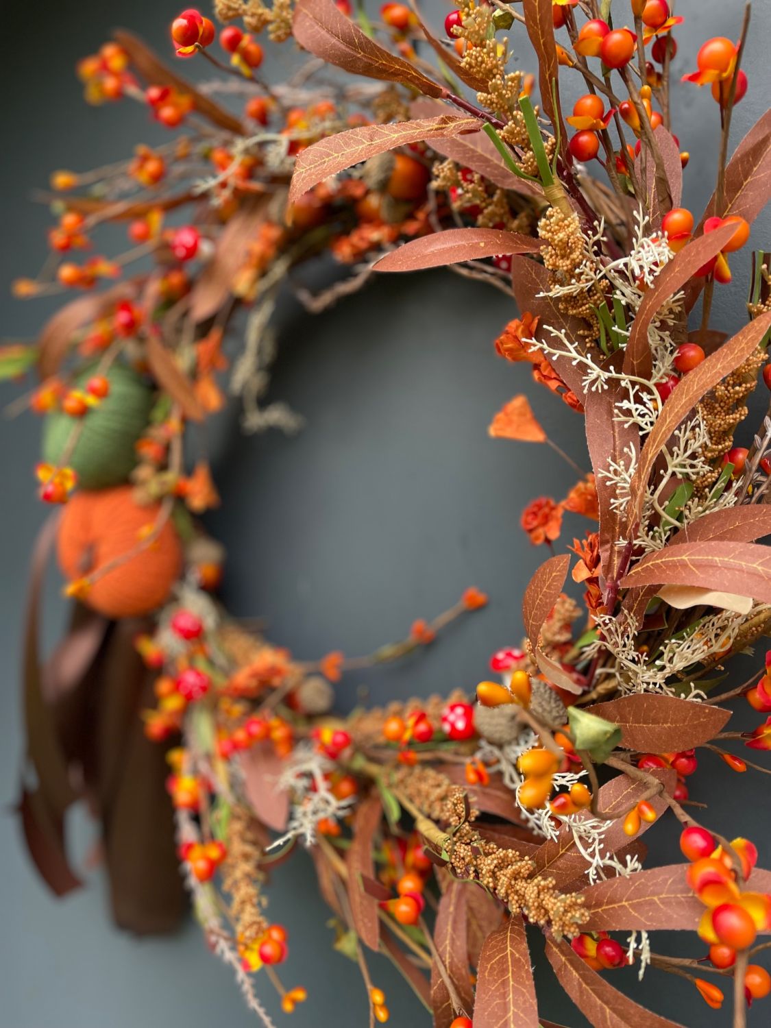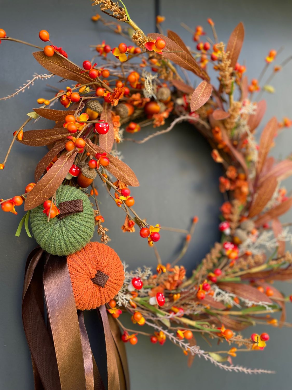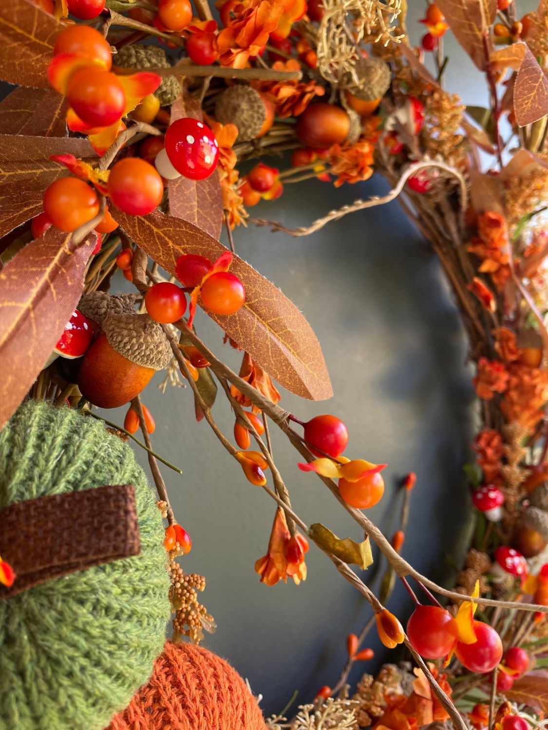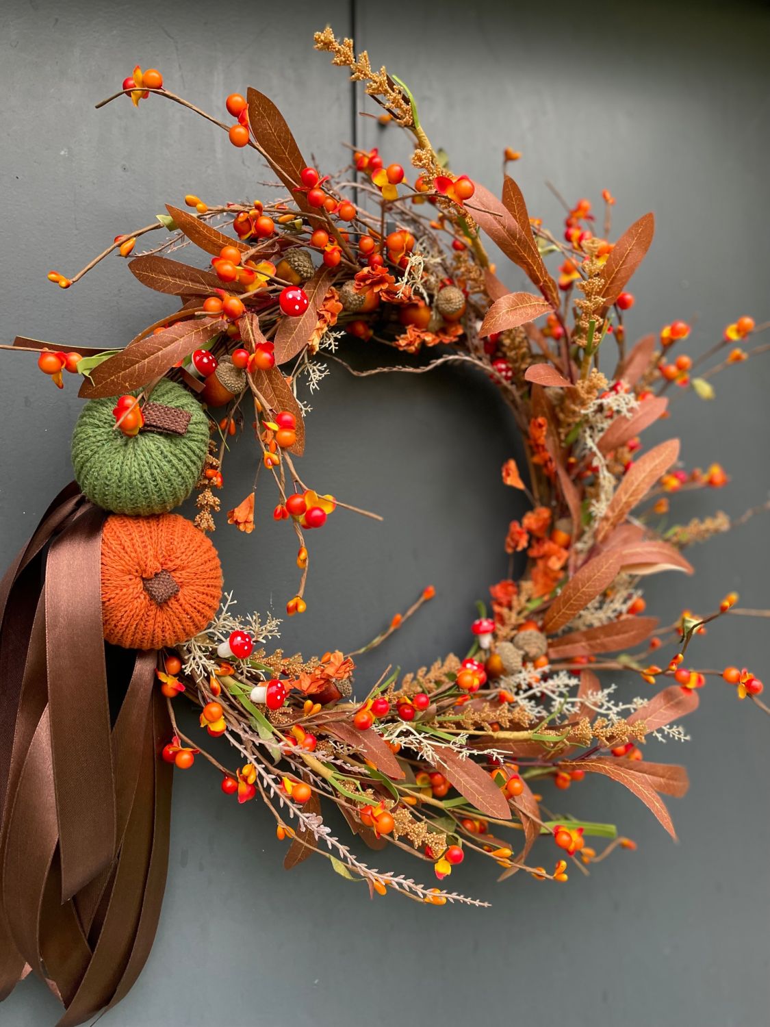 Elle se compose d'une base de couronne en vigne naturelle, de branchages, baies et champignons artificiels et de fleurs en papier, ainsi que de rubans en satin et de petites courges en tricot.